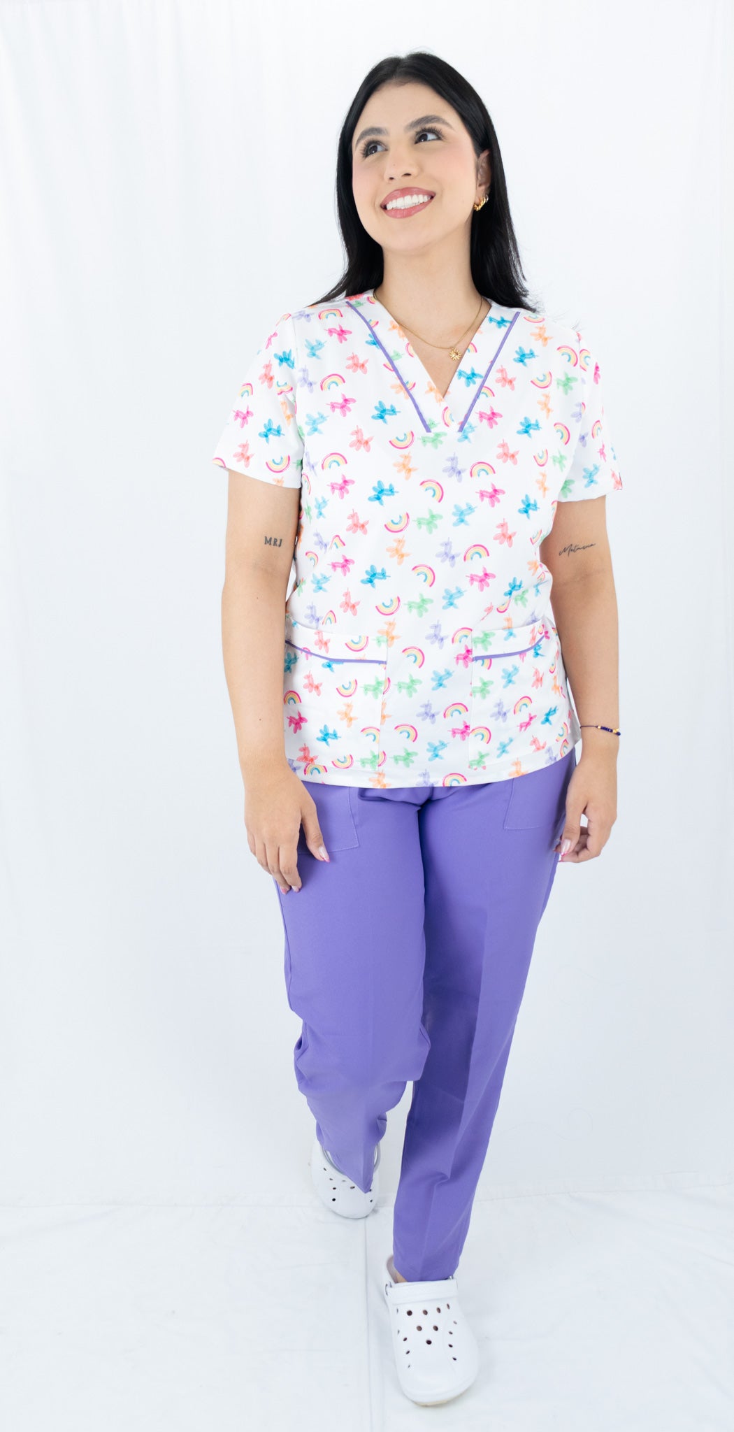 Conjunto blusa estampada que te brinda seguridad en el trabajo gracias a su tecnología antifluido que te protege contra las salpicaduras accidentales de fluidos e impiden que el cuerpo tenga contacto con ellos. Pantalón En lino poliéster Beige duradero y resistente. Ideal para niñeras y servicio doméstico.