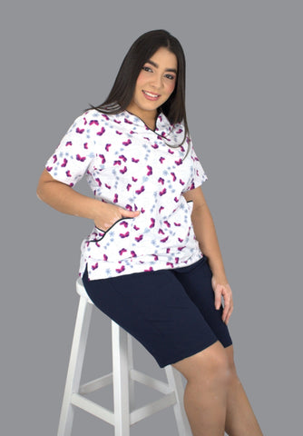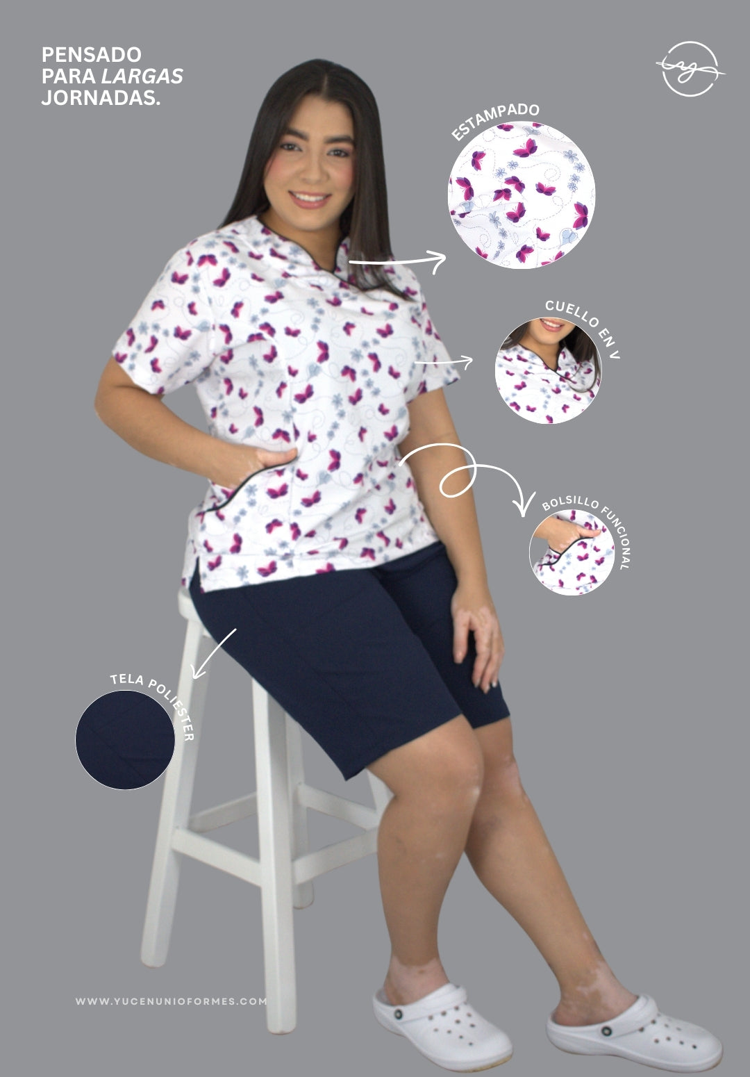 Su estampado exclusivo con detalles infantiles aporta un toque alegre y cercano, ideal para entornos donde la calidez hace la diferencia. La blusa cuenta con cuello en V y bolsillos funcionales, mientras que la bermuda en tono azul turquí, ofrece comodidad, suavidad y libertad de movimiento.