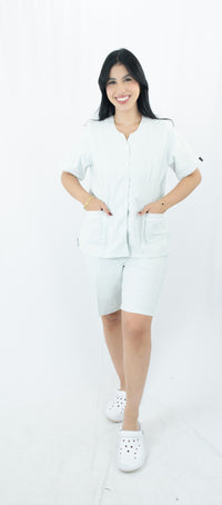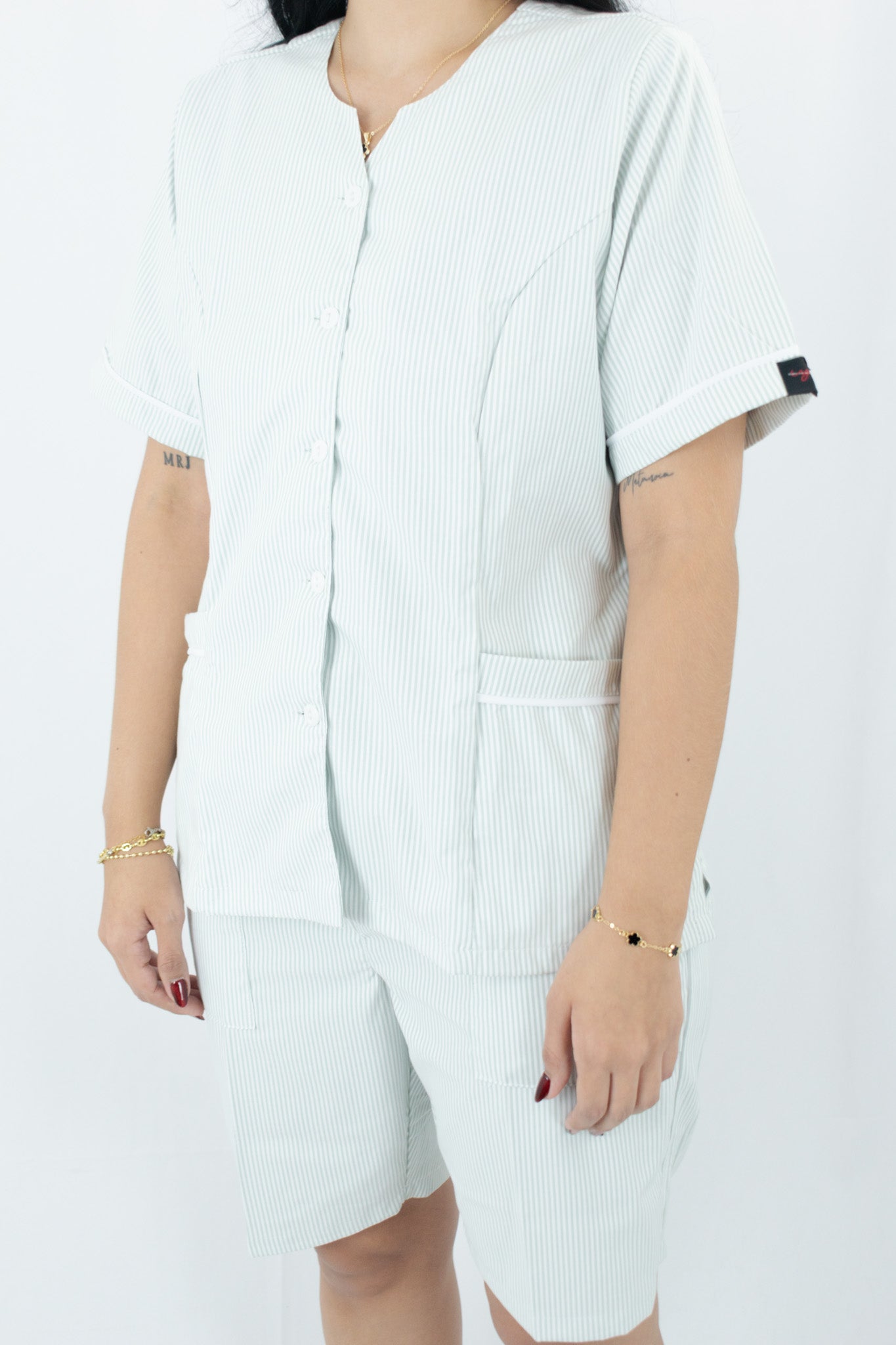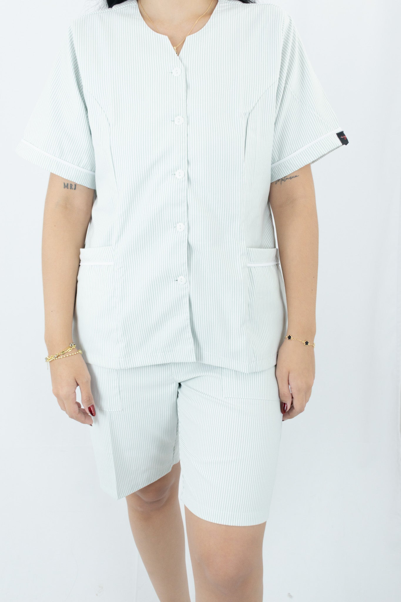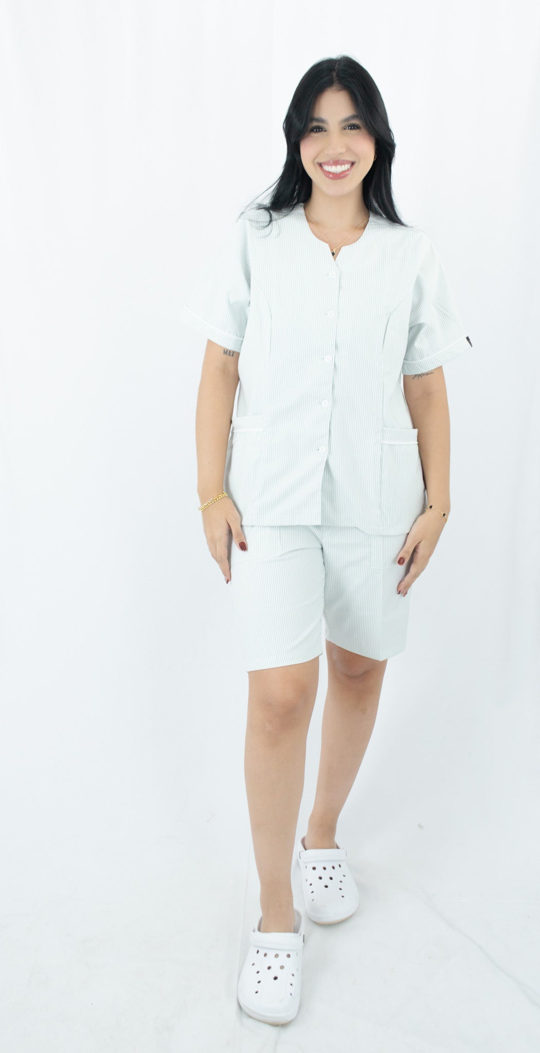 Conjunto en oxford verde, blusa cuello en V y bolsillos. Bermuda con pretina adelante y resorte atrás para mayor comodidad. Tela fresca y duradera ideal para trabajos domésticos del hogar.