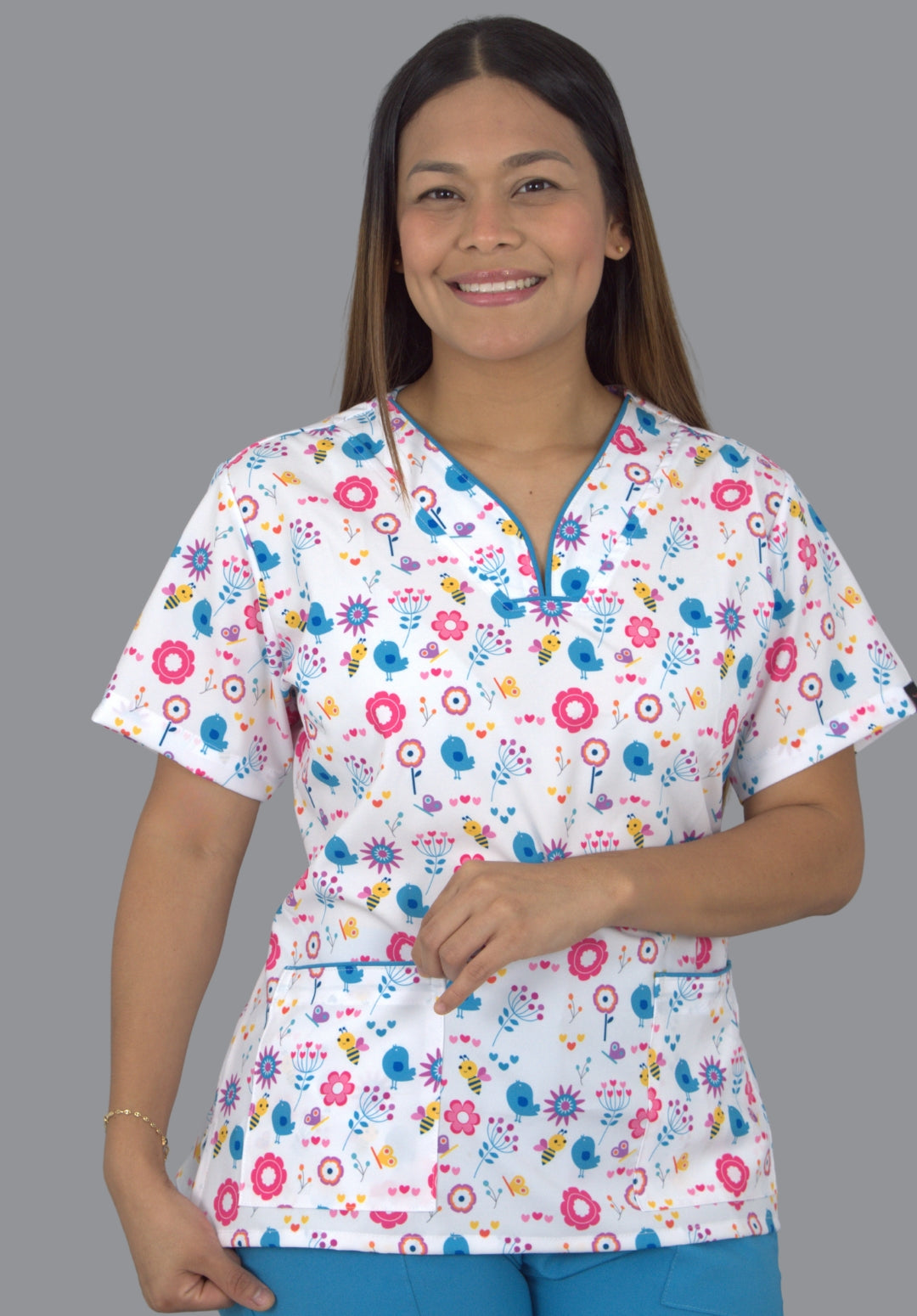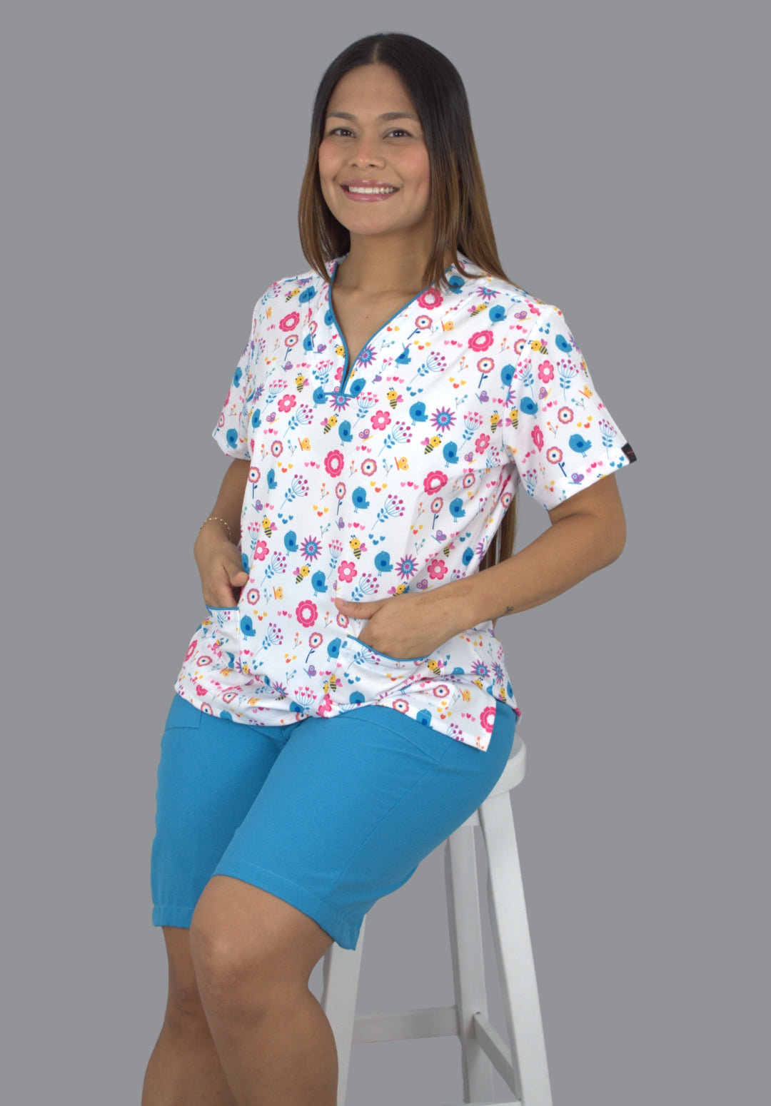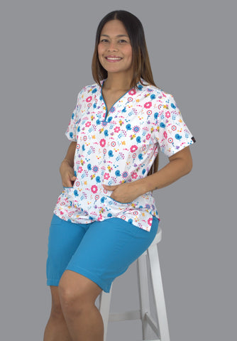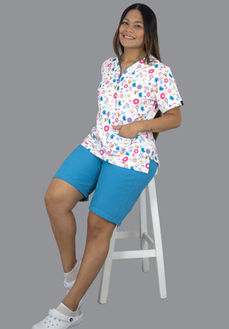 Su estampado exclusivo con detalles aporta un toque alegre y cercano, ideal para entornos donde la calidez hace la diferencia. La blusa cuenta con cuello en V y bolsillos funcionales, mientras que la bermuda en tono azul ofrece comodidad, suavidad y libertad de movimiento.