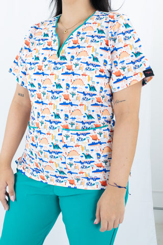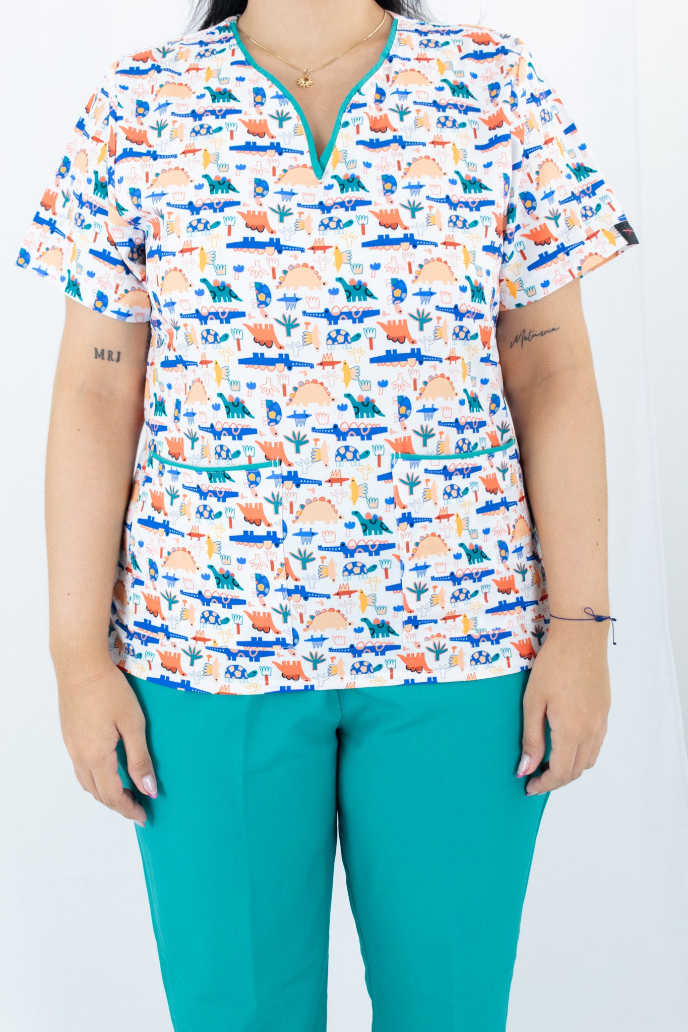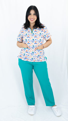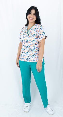 Conjunto blusa estampada que te brinda seguridad en el trabajo gracias a su tecnología antifluido que te protege contra las salpicaduras accidentales de fluidos e impiden que el cuerpo tenga contacto con ellos. Pantalón En lino poliéster verde aqua duradero y resistente. Ideal para niñeras y servicio doméstico.
