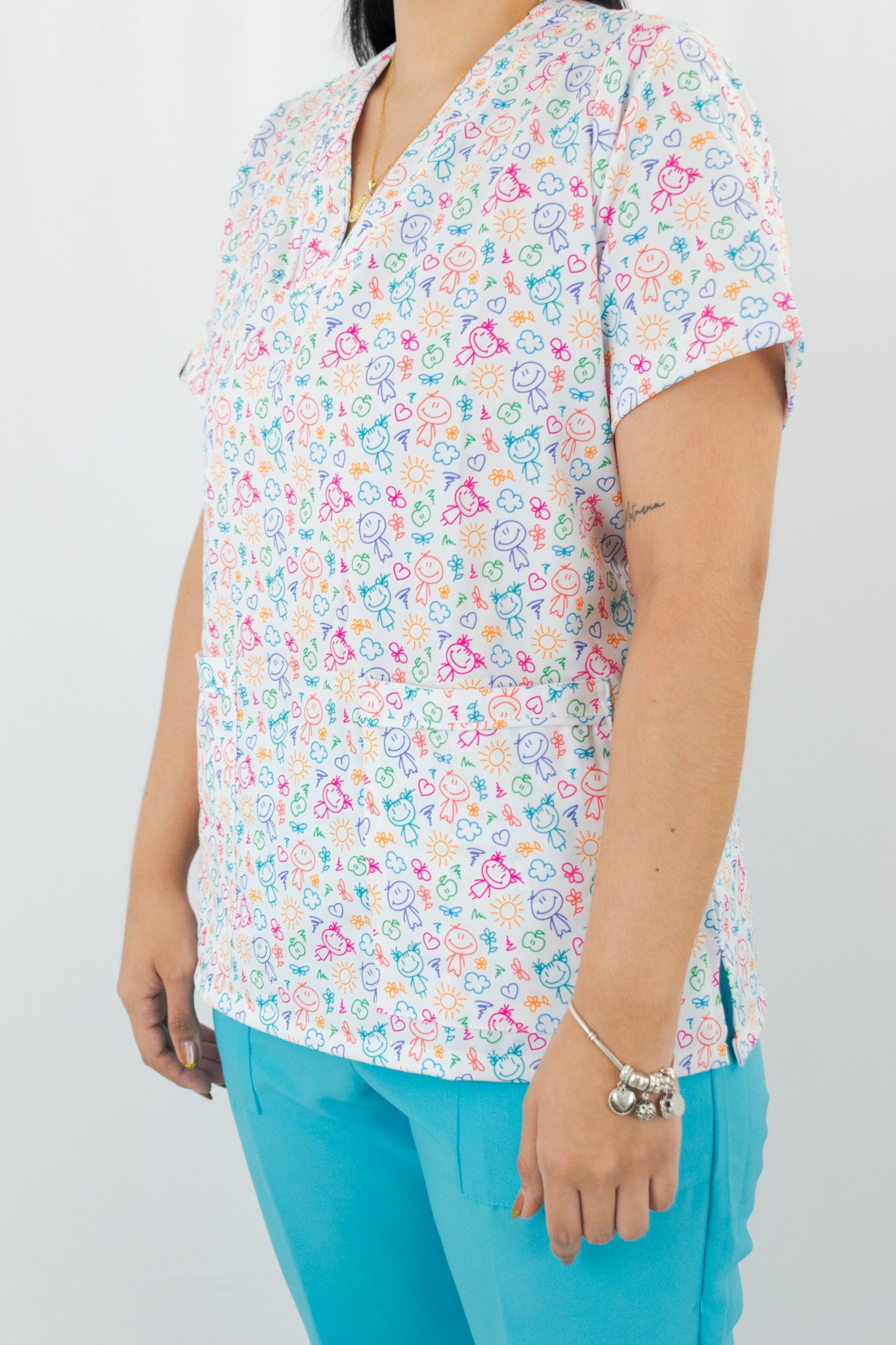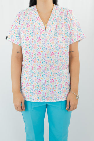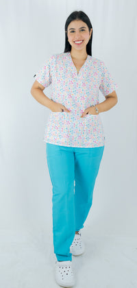 Conjunto blusa estampada que te brinda seguridad en el trabajo gracias a su tecnología antifluido que te protege contra las salpicaduras accidentales de fluidos e impiden que el cuerpo tenga contacto con ellos. Pantalón En lino poliéster color Aqua duradero y resistente. Ideal para niñeras y servicio doméstico y enfermeria.