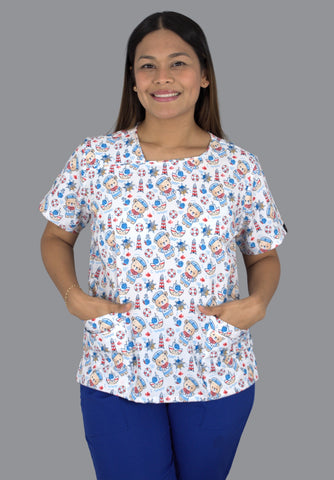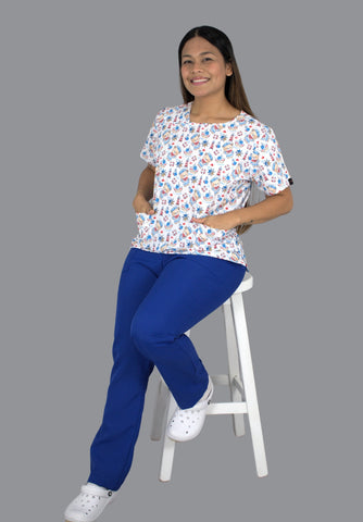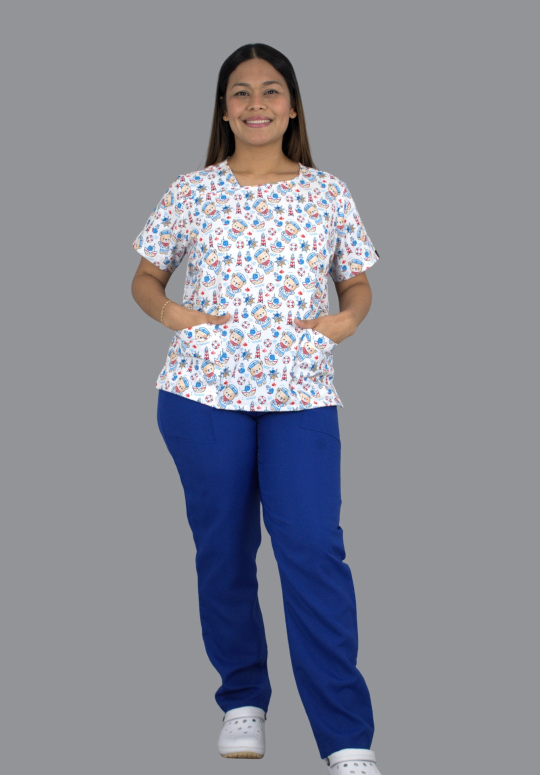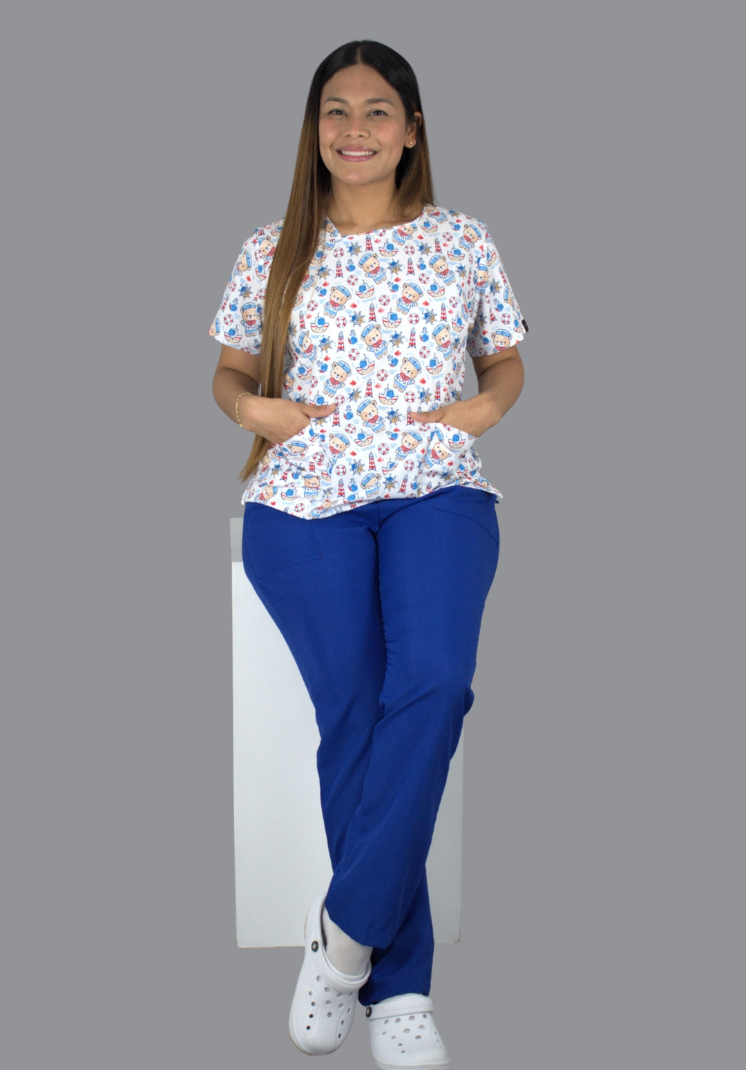 Su estampado exclusivo con detalles infantiles aporta un toque alegre y cercano, ideal para entornos donde la calidez hace la diferencia. La blusa cuenta con cuello en V y bolsillos funcionales, mientras que el pantalón en tono azul rey, ofrece comodidad, suavidad y libertad de movimiento.