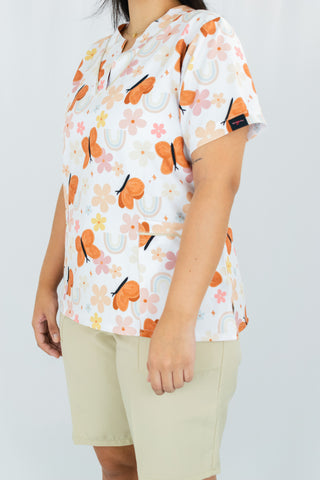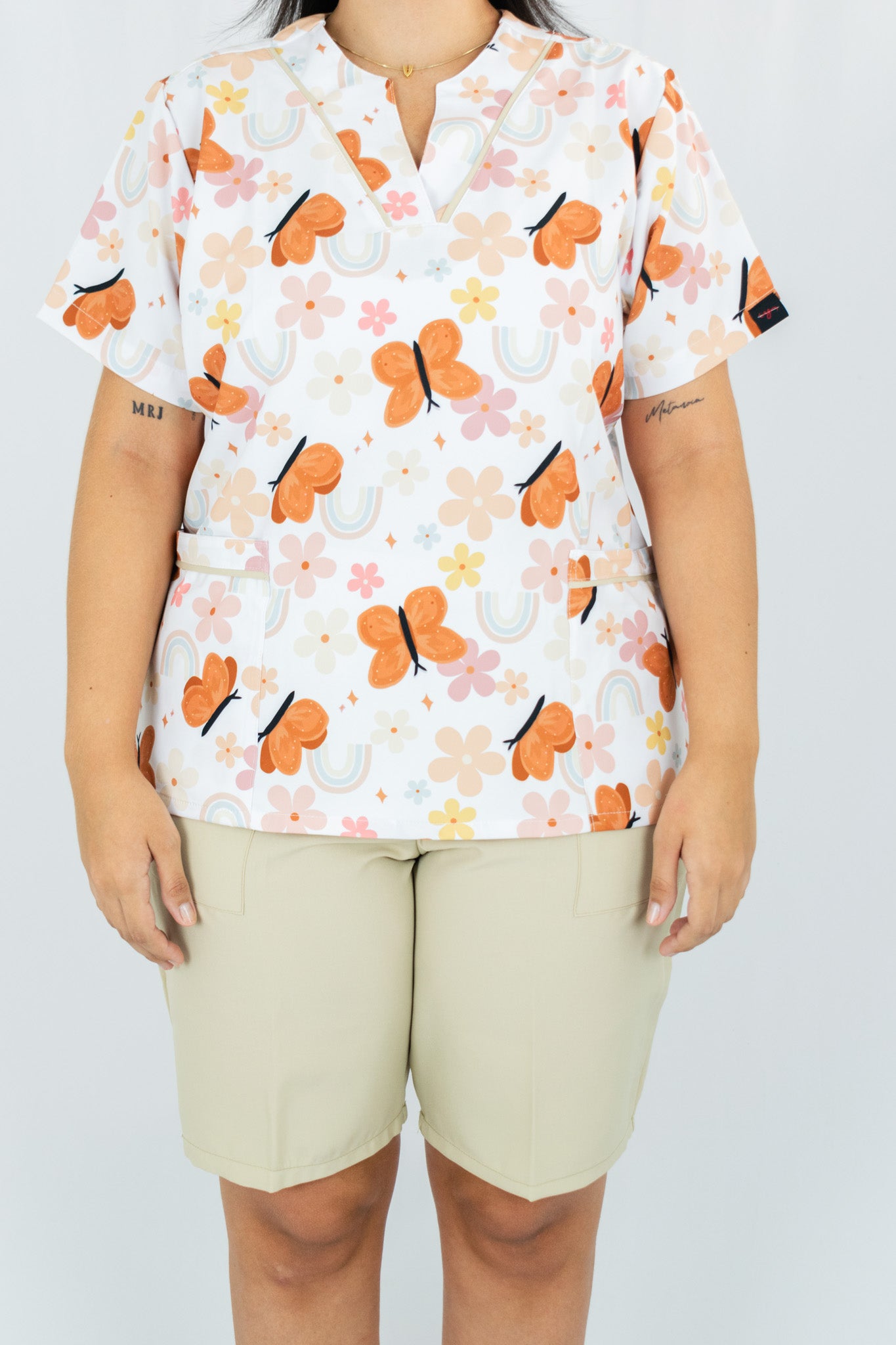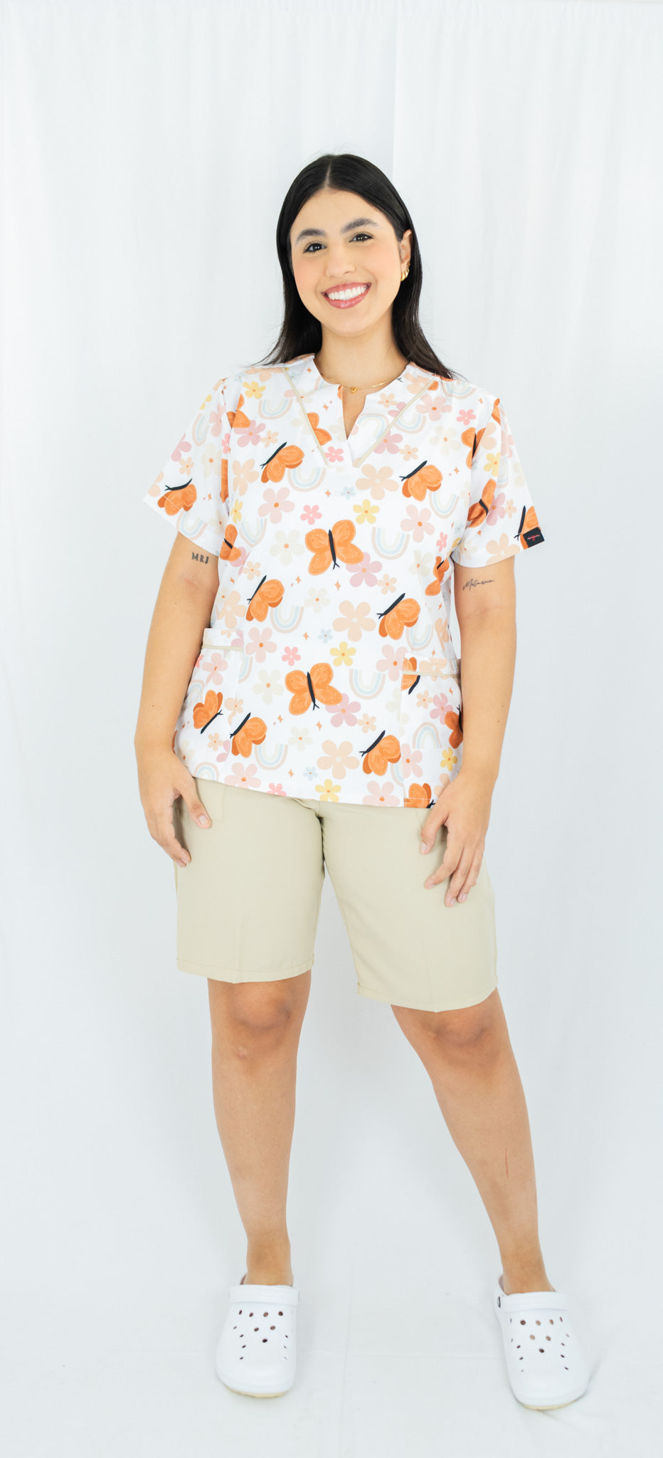 Conjunto blusa estampada que te brinda seguridad en el trabajo gracias a su tecnología antifluido que te protege contra las salpicaduras accidentales de fluidos e impiden que el cuerpo tenga contacto con ellos. Bermuda en lino poliéster Beige duradero y resistente. Ideal para niñeras y servicio doméstico.