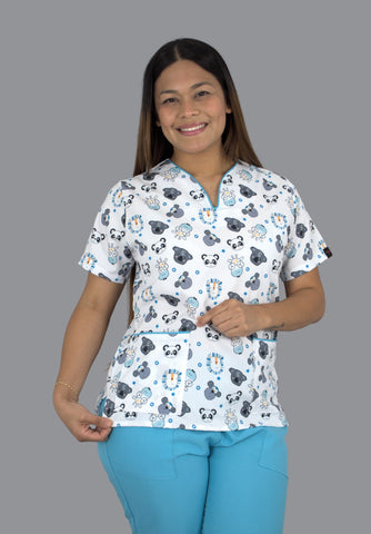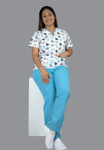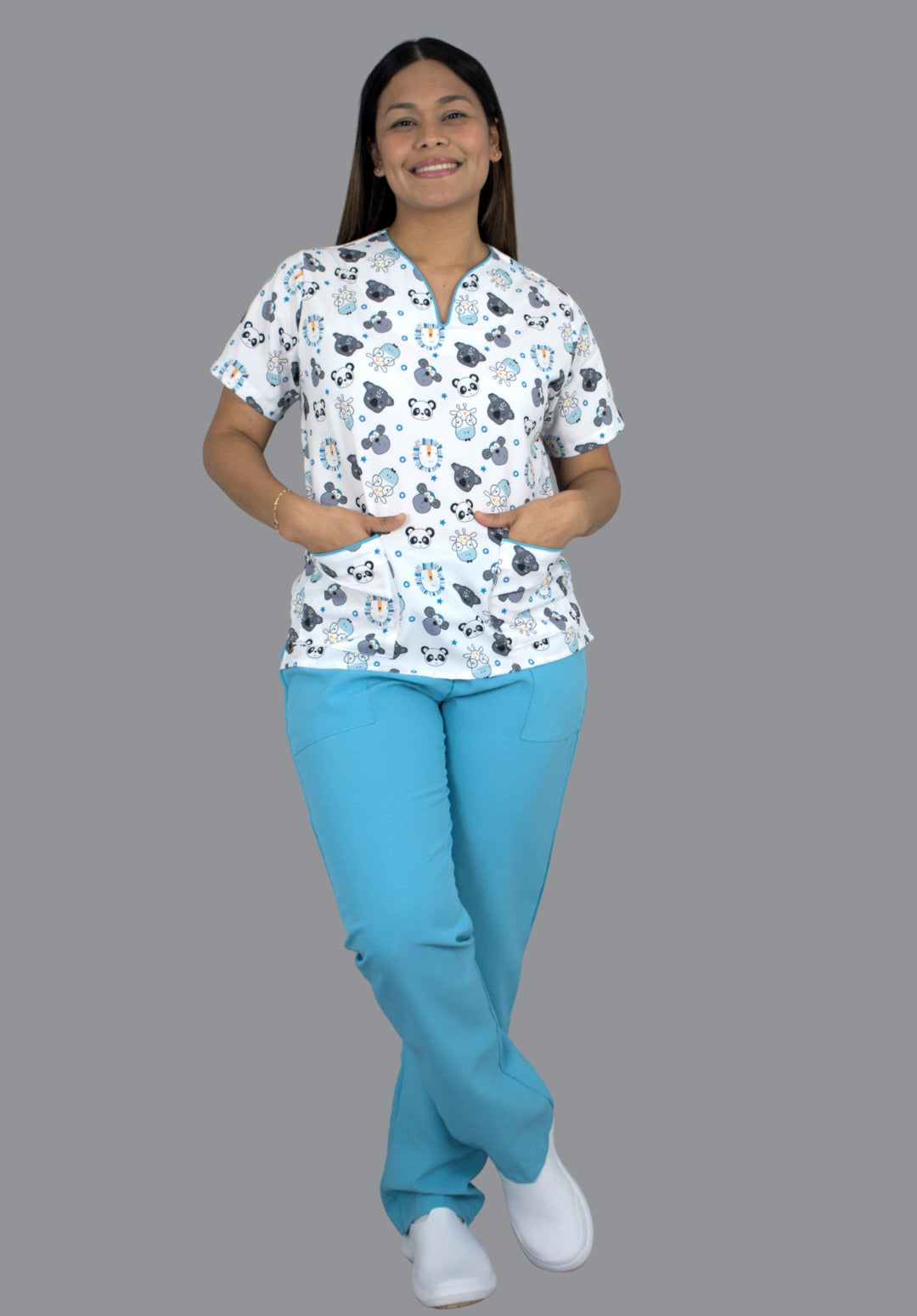 Su estampado exclusivo con detalles infantiles aporta un toque alegre y cercano, ideal para entornos donde la calidez hace la diferencia. La blusa cuenta con cuello en V y bolsillos funcionales, mientras que el pantalón en tono azul, ofrece comodidad, suavidad y libertad de movimiento.